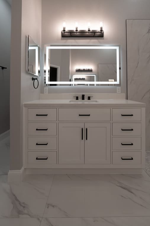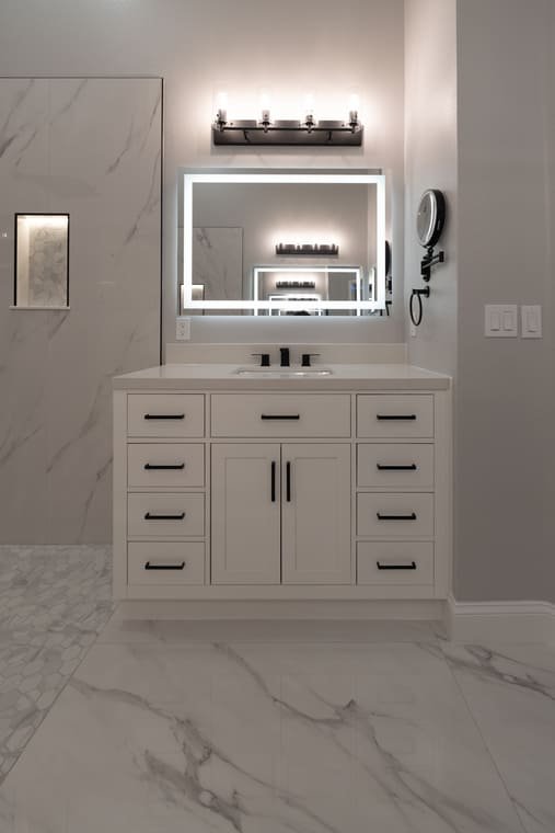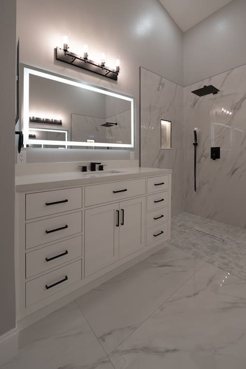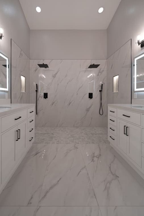 This master bathroom remodel delivers a refined, spa-inspired experience with a clean architectural layout and premium finishes. Large-format marble-look porcelain tile, a seamless walk-in shower, and custom double vanity create a space that feels open, elegant, and timeless—designed and built by Fenthus LLC.